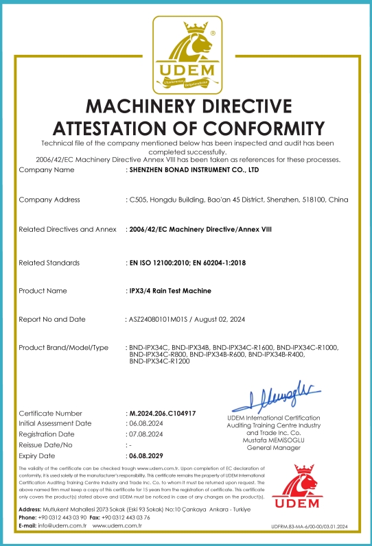 MACHINERY DIRECTIVEATTESTATION OF CONFORMITY for IPX3/4 rain test machine